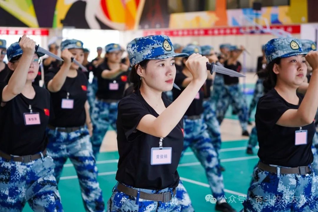 隨著軍訓的深入,學生們學習了軍體拳和匕首操。這些訓練項目不僅要求學生們展現出力量,更要求他們掌握技巧和節奏。軍體拳訓練,每一次出拳、每一次跨步,都是對自我控制力的挑戰;匕首操方陣,新人們橫砍豎削,所向披靡,都體現出沖鋒陷陣的果敢豪氣。