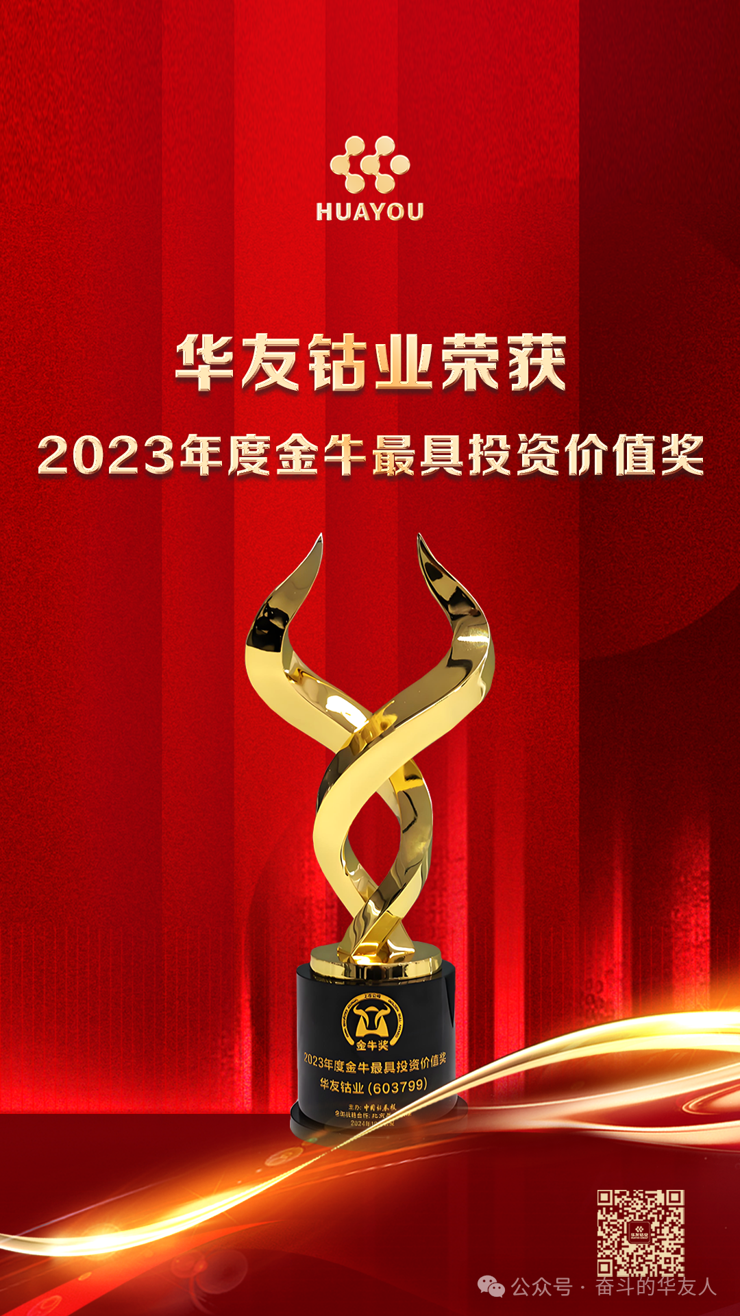 On October 24th, the 2024 High-Quality Development Forum for Listed Companies, themed "New Quality Productivity and Industrial Innovation Synergy," and the 26th Golden Bull Awards Ceremony for Listed Companies was held in Nantong, Jiangsu. The highly anticipated Golden Bull Awards list was officially announced. Huayou Cobalt (603799.SH) stood out among numerous listed companies and won the "2023 Golden Bull Most Investment Value Award."