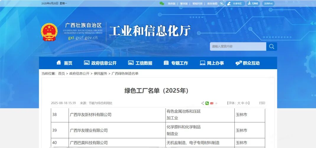 Recently, the Department of Industry and Information Technology of Guangxi Zhuang Autonomous Region announced the 2025 Guangxi Green Manufacturing List, highlighting that three companies from Huayou's Guangxi campus—Guangxi Huayou New Materials Co., Ltd., Guangxi Huayou Lithium Industry Co., Ltd., and Guangxi Bamoo Technology Co., Ltd.—have been simultaneously recognized as green manufacturing facilities. This achievement underscores Huayou's outstanding success and unwavering commitment to advancing sustainable manufacturing practices.