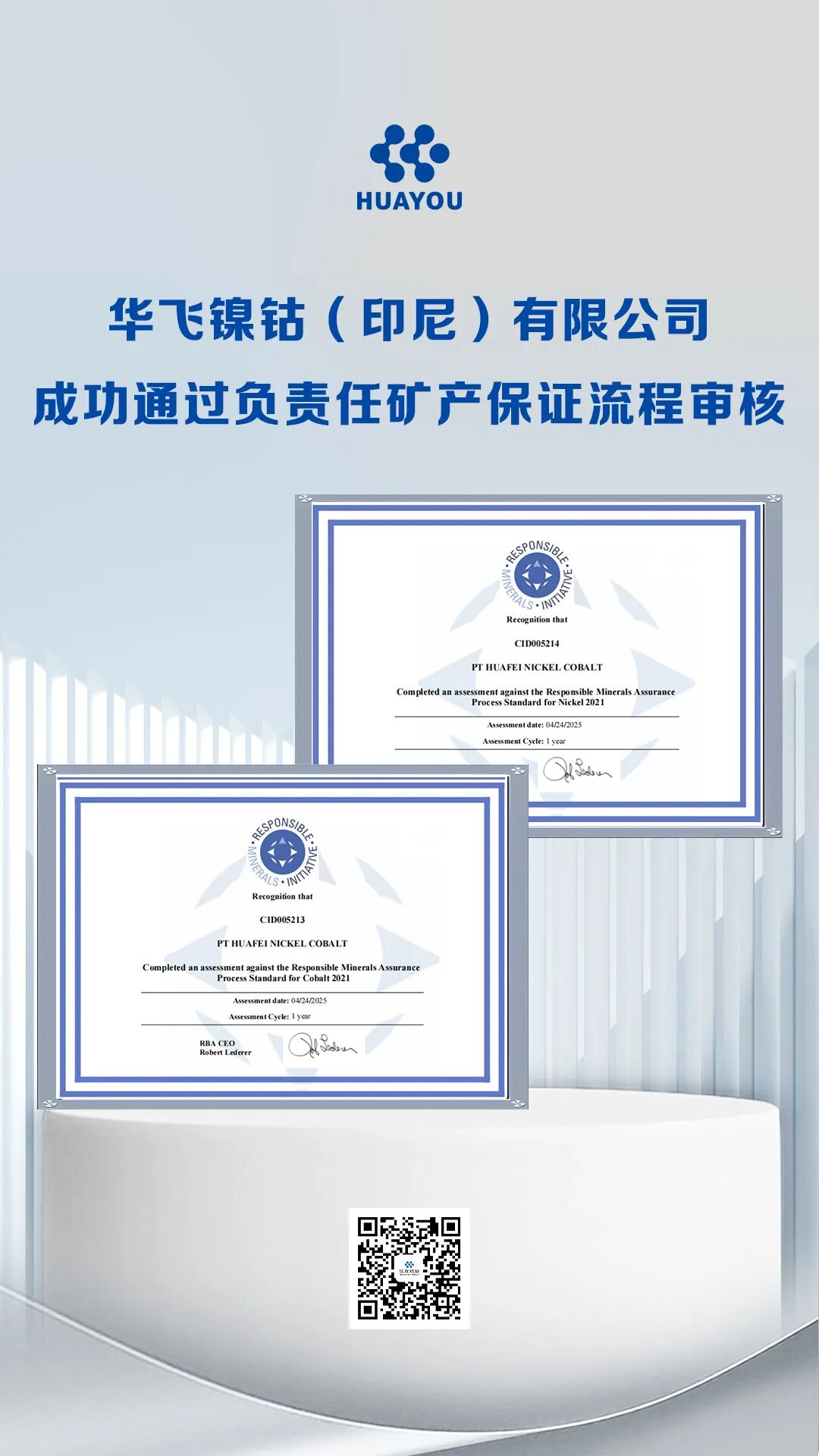 In August, the Responsible Minerals Initiative (RMI) official website announced that Huafei Nickel Cobalt (Indonesia) Co., Ltd. had successfully passed the Responsible Minerals Assurance Process (RMAP) audit. Huafei has become an Indonesian smelting enterprise conducting due diligence management on nickel and cobalt mineral supply chains and passing the RMAP audit.