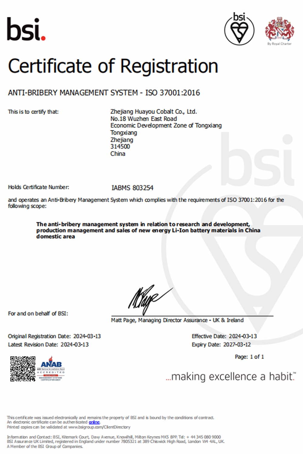 在英國標(biāo)準(zhǔn)協(xié)會(huì)BSI的審核下,華友鈷業(yè)通過反賄賂管理體系ISO37001:2016認(rèn)證并獲得相關(guān)證書,成為行業(yè)內(nèi)率先獲得ISO37001:2016認(rèn)證的企業(yè),在全球化合規(guī)治理上邁出重要步伐。