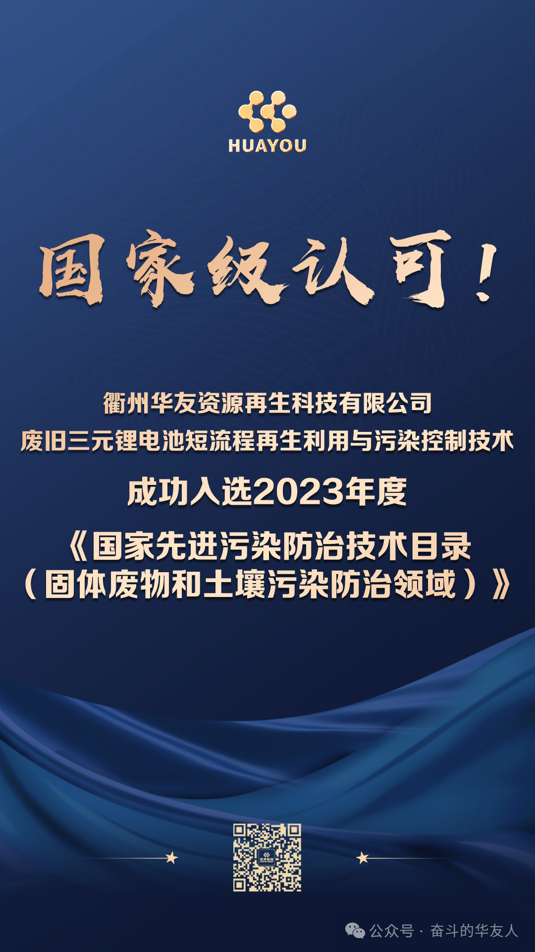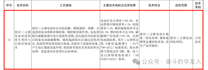 近日,衢州華友資源再生科技有限公司獨立研發技術——廢舊三元鋰電池短流程再生利用與污染控制技術,成功入選“三年一評選”的2023年度《國家先進污染防治技術目錄(固體廢物和土壤污染防治領域)》(以下簡稱《目錄》)三元鋰電回收領域全國僅兩家入選國家級固體廢物污染防治領域示范技術。