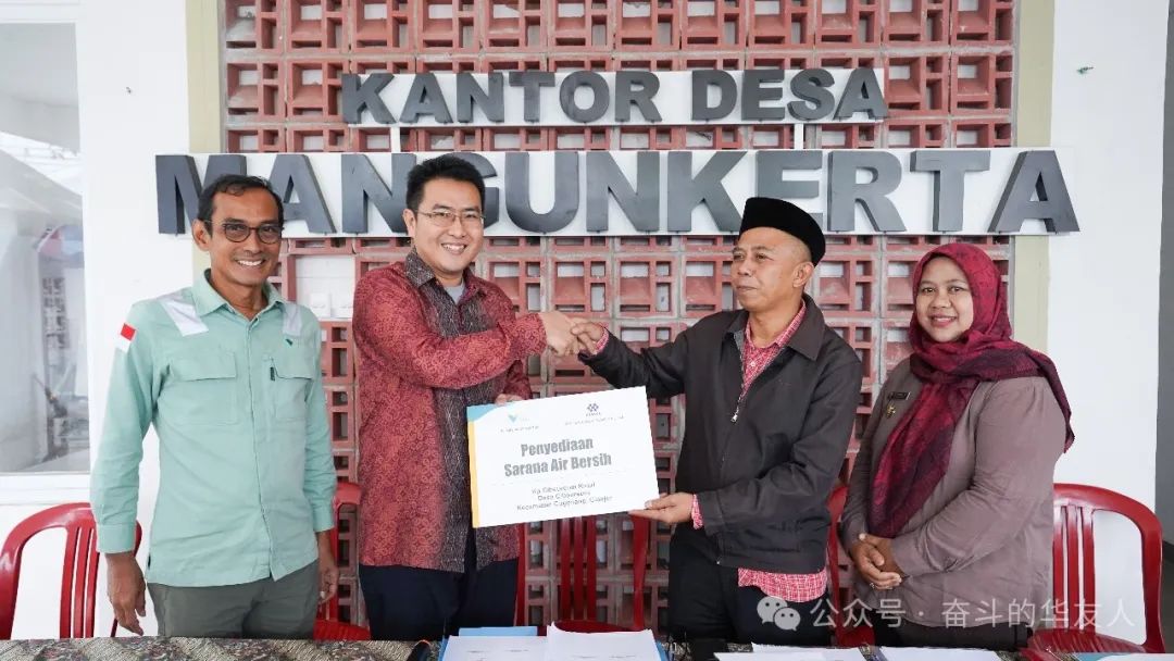 近日, 華友和印尼淡水河谷公司在西爪哇省吉安竹市Mangunkerta村辦事處舉行了供水項目一期交接儀式。儀式上,印尼淡水河谷副總裁Adriansyah Chaniago和華友印尼公共事務(wù)部部長甄德龍向Cibeureum村村長Asep Nahdoh和Mangunkerta村村長Ira頒發(fā)了捐贈證書。