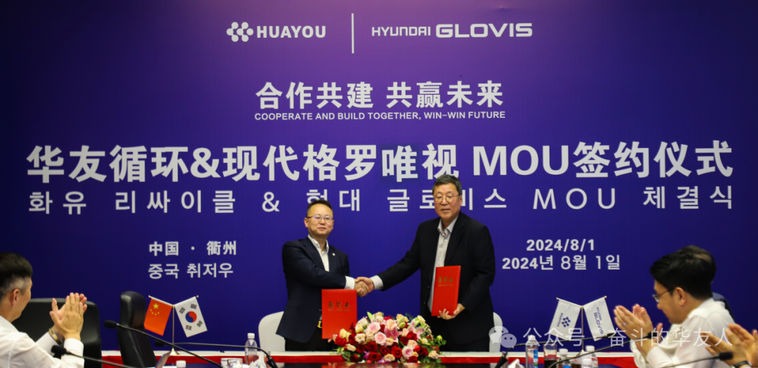 為加速動力鋰電池全球回收布局,攜手構建資源回收、循環利用可持續發展生態鏈。8月1日,浙江華友循環科技有限公司(以下簡稱“華友循環”)與現代汽車集團旗下現代格羅唯視(Hyundai Glovis,以下簡稱“現代格羅唯視”)在華友衢州產業園正式簽署MOU(諒解備忘錄),雙方將發揮核心優勢,共同攜手開啟動力鋰電池全生命周期開放合作新篇章。現代格羅唯視李圭馥代表、華友循環總經理鮑偉出席簽約儀式。
