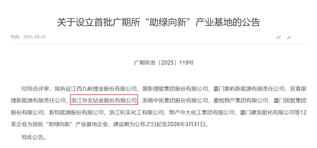 經過全面而嚴格的資質考察與遴選,華友鈷業憑借其在新能源領域的卓越表現和強大的綜合實力,成功獲批成為廣期所首批“助綠向新”產業基地,開啟了綠色低碳發展的新征程。