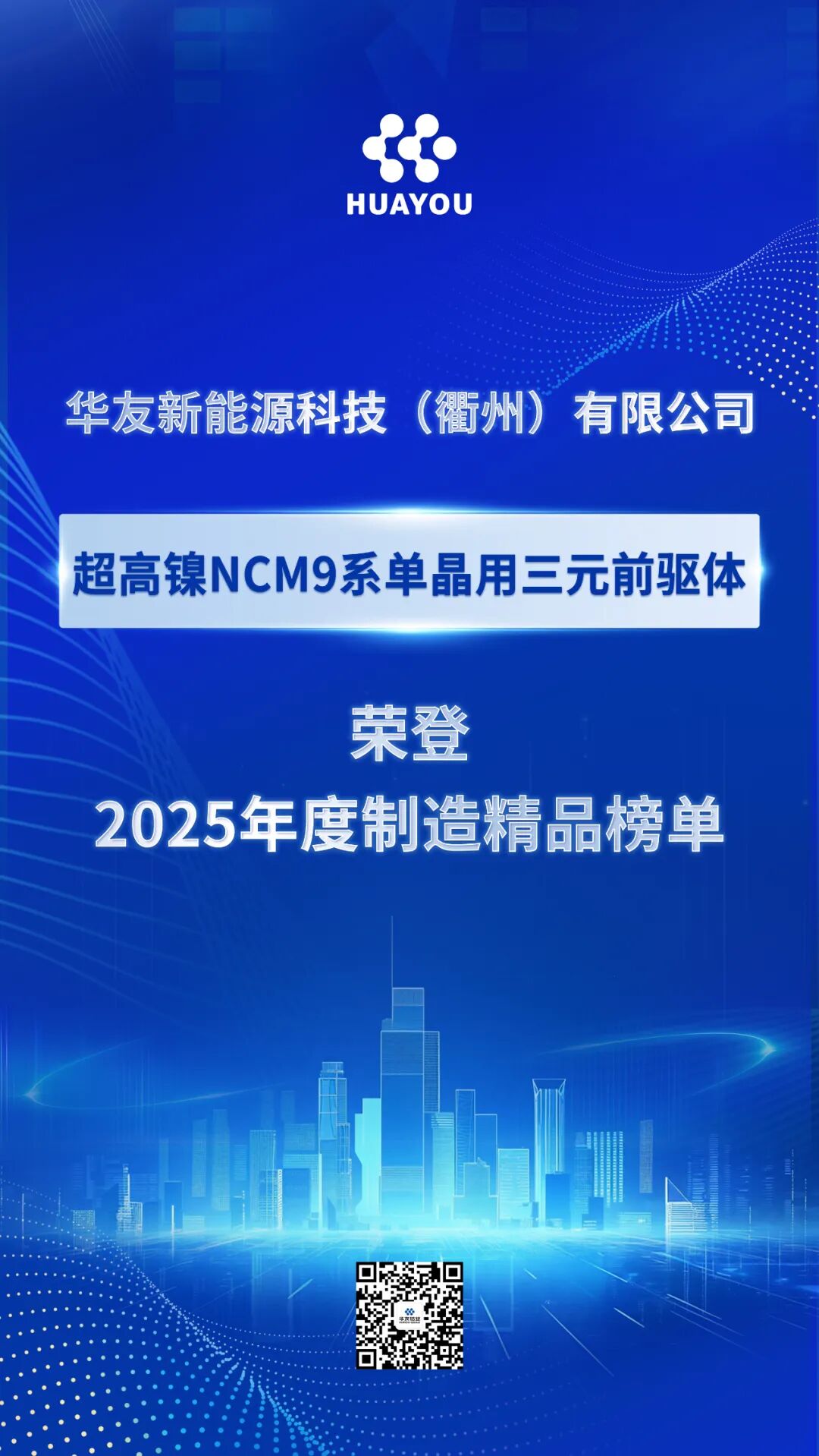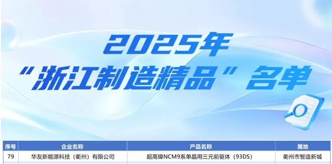 奮戰100天系列之技術創新 | 華友超高鎳NCM9系單晶用三元前驅體榮登2025年度"浙江制造精品"榜單