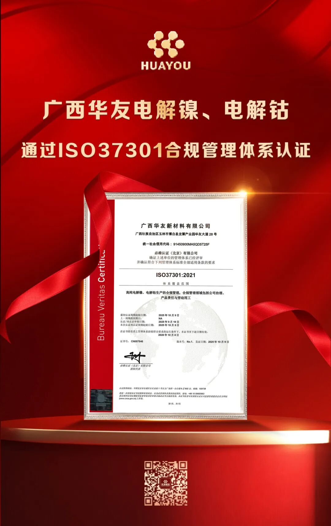 近日,華友鈷業(yè)旗下廣西華友新材料有限公司正式獲得國際權(quán)威認(rèn)證機(jī)構(gòu)頒發(fā)的ISO 37301合規(guī)管理體系認(rèn)證證書,為華友國際化戰(zhàn)略奠定了堅(jiān)實(shí)的合規(guī)基礎(chǔ)。