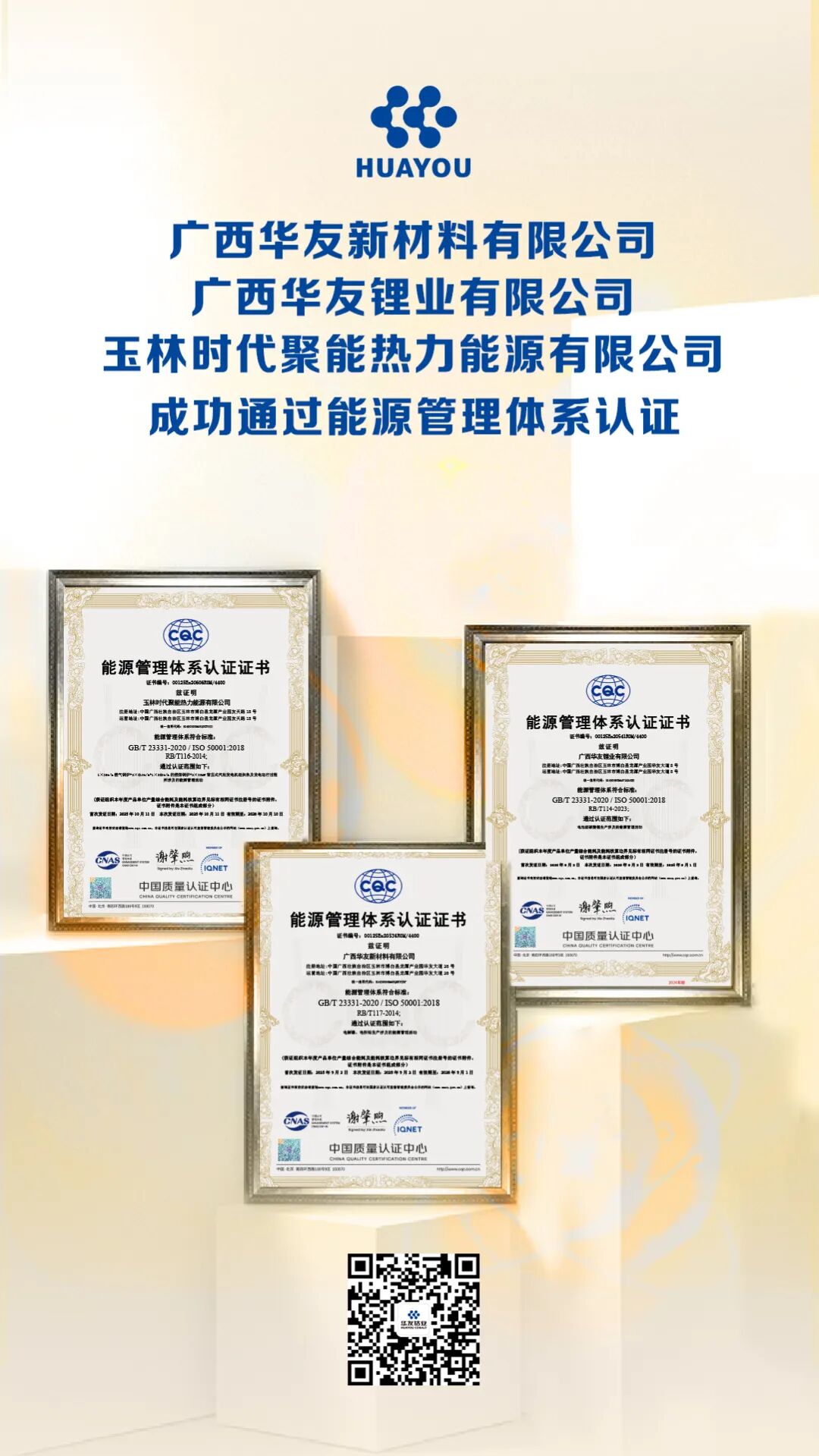 近日,華友鈷業(yè)下屬三家子公司傳來喜訊:廣西華友新材料有限公司、廣西華友鋰業(yè)有限公司及玉林時(shí)代聚能熱力能源有限公司,成功通過ISO50001能源管理體系認(rèn)證。