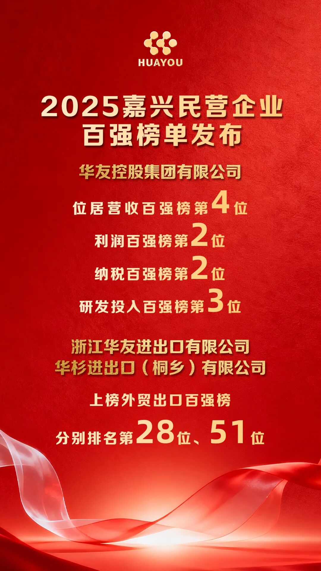 華友控股集團(tuán)有限公司分別位居營收百強(qiáng)榜第4位,利潤榜第2位,研發(fā)投入榜第3位,納稅榜第2位。浙江華友進(jìn)出口有限公司位居外貿(mào)出口榜第28位。華杉進(jìn)出口(桐鄉(xiāng))有限公司位居外貿(mào)出口榜第51位。