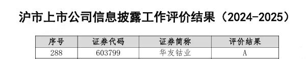 近日,上海證券交易所公布滬市上市公司2024–2025年度信息披露工作評價結果,華友鈷業榮獲最高評價—A級,體現了監管機構對公司在信息披露、公司治理及投資者關系管理等方面工作的權威認可,也是資本市場對公司規范運作水平和長期價值創造能力的高度肯定。