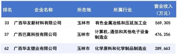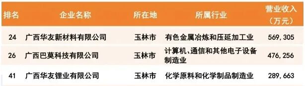 在廣西民營(yíng)企業(yè)100強(qiáng)榜單中,廣西華友新材料有限公司位列第33名,廣西巴莫科技有限公司緊隨其后排名第37位,廣西華友鋰業(yè)有限公司位居第62名;
