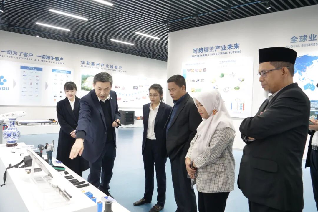 來訪期間,魯斯迪·努爾校長一行實地參觀了華友衢州產業園區前驅體、正極材料等主要生產車間,走訪了衢州職業技術學院校史館、數字中樞、工業互聯網實訓中心、智能制造實訓中心等。