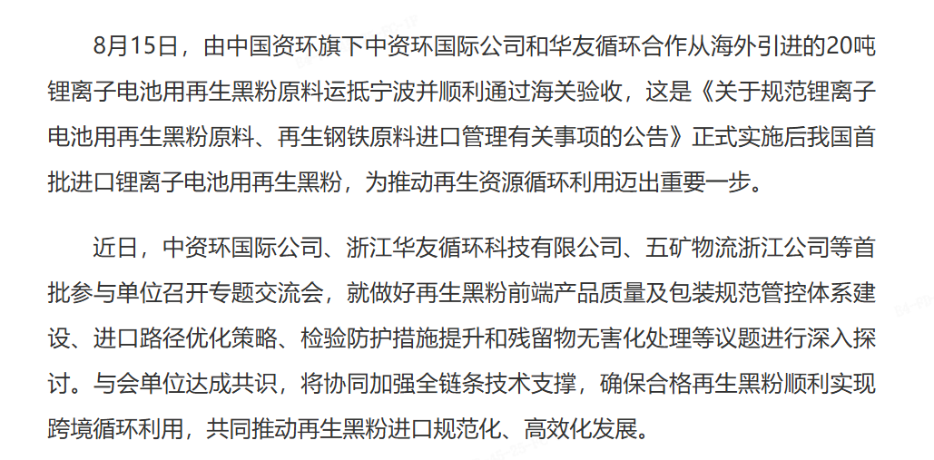 8月15日,由中國資環旗下中資環國際公司和華友循環合作從海外引進的20噸鋰離子電池用再生黑粉原料運抵寧波并順利通過海關驗收,這是《關于規范鋰離子電池用再生黑粉原料、再生鋼鐵原料進口管理有關事項的公告》正式實施后我國首批進口鋰離子電池用再生黑粉,為推動再生資源循環利用邁出重要一步。